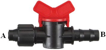 2. 将阀体的双倒刺B端插入修剪好的滴灌管(或PE管)内,保证双倒刺全部没入滴灌管(或PE管)内。